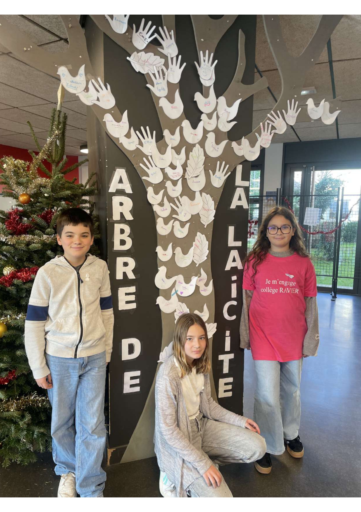 L'arbre déjà existant a été transformé par les élèves du CVC en arbre de la laïcité. Chaque élève volontaire est venu mettre une feuille, une colombe ou une main avec son prénom dessus à 13h.